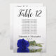 These beautiful table number cards will make it easy for your guests to find their seats at your wedding reception. They feature a simple yet elegant design with script calligraphy lettering and a single long-stemmed vivid royal blue or cobalt coloured rose lying on its side reflecting in water. The card includes a seating chart with 10 names. There is also space for the couple's names and wedding date. This card is available in a variety of sizes and is larger than our standard table number cards.