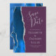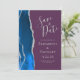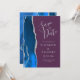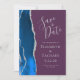 This elegant modern save the date card features a royal blue watercolor agate border trimmed with faux silver glitter. The customisable text is silver grey on a plum background. The reverse side features a matching royal blue and silver agate design.