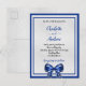 A modern, elegant wedding invitation. Faux silver looking background decorated with royal blue frames and bow. Personalise and add your names and wedding details. Black coloured letters.