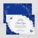 Royal blue silver and white floral Quinceanera thank you card. Features, script font, silver butterflies, watercolor roses and tiara. Perfect for an elegant princess style glam celebration. Personalize with your own details.