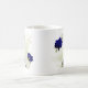 Beautiful coffee mug featuring royal blue and white flowers and green leaves