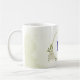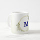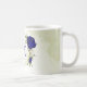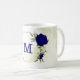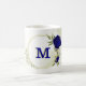 Beautiful coffee mug featuring royal blue and white flowers and green leaves