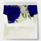 Beautiful wedding envelope featuring royal blue and white flowers and green leaves