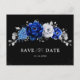 Elegant royal blue white silver theme wedding save the date postcard featuring elegant bouquet of royal blue, Navy, silver, pure white colour rose flowers buds and sage green eucalyptus leaves. Please contact me for any help in customisation or if you need any other product with this design.