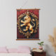 A luxurious seamless repeating heraldic pattern featuring grand crests with crowned lions rampant and double-headed eagles, outlined in burnished gold leaf over a deep burgundy velvet-textured background. Each crest is spaced with delicate fleur-de-lis motifs and thin gold diamond lattice lines, with subtle aged parchment warmth bleeding through the fabric texture to create a centuries-old tapestry look.