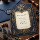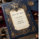 Make a grand announcement with this 'Save the Date' card, a perfect fusion of mediaeval heraldry and celestial charm. The deep navy and opulent gold colour palette creates a luxurious and sophisticated feel, while the central crest with crossed swords and ornate scrollwork evokes a sense of timeless elegance. Adorned with subtle celestial motifs and detailed floral embellishments, this card is designed to impress. It's an unforgettable way to inform your guests about your wedding date, setting the stage for a celebration steeped in romance and historical allure.