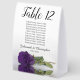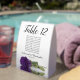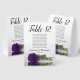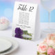 These tent table number signs are not only beautiful, they even include a list of names for the guests at each table, making it easy for your guests to find their seat at your wedding reception. The design is both elegant and romantic featuring a single royal purple coloured rose lying on its side reflecting in water with waves and ripples. The title is in lacy script calligraphy with bold numbers so your guests can easily find the right table. There is room for the names of the couple and the wedding date.