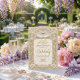 Transport your guests to a bygone era of opulence with this regal design that perfectly sets the tone for your fairytale union. Ideal for couples seeking a vintage glamour aesthetic, this layout whispers of romance, grandeur, and timeless elegance. Personalize the text details to create a majestic keepsake that celebrates your unique love story.This is a flat-printed card featuring a high-resolution digital illustration designed to simulate a rich, tactile experience. The background displays a faux quilted diamond tufting pattern in warm beige and sepia tones, creating a plush appearance. An ornate, faux gold architectural frame surrounds the central text area, adorned with elaborate acanthus leaf scrollwork and lush rose floral bouquets. At the top center, two white swans face one another, their necks arching to form a heart shape against a central geometric mandala rosette. The design is flanked by illustrated draped satin fabric curtains in a champagne hue. Typography features elegant black calligraphy script for names, paired with a classic vintage serif font for details.