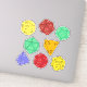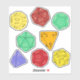 This sheet contains 8 different die cut style stickers depicting different fantasy game or role-playing game dice in yellow, red, green, orange, and purple with illustrations of 12-sided, 20-sided and 4-sided dice.