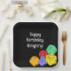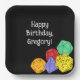 Whether you're throwing a game-themed party or a party for someone who loves fantasy and role-playing games these personalised paper plates are a perfect choice. They feature illustrations of rpg style dice with 20-sided, 12-sided and 4-sided dice in bright colours against a black background.