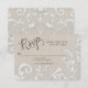Coordinated RSVP response card for the BOHO Rustic barn wood and lace, chic style invitation set that was designed for a wedding that is country farm, barn, rustic, elegant and relaxed! Typography, fun style with script calligraphy typography headings in a handwritten calligraphy font (YES we can customise these for you, just message us and allow a few days to create them for you). The background is in a soft grey weathered wood with subtle swirls and a double arrow typographic divider separates the details. On the reverse side is the full lace pattern over the barn wood background. Art copyright Audrey Jeanne Roberts, all rights reserved.