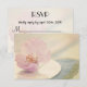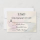 A dreamy magical RSVP card. A single cherry blossom flower showing off its fragile petals and soft pink colour. This pretty floral can be seen sitting alone on a white porcelain plate placed on a table. A soft and delicate design.