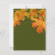 Matching RSVP Response card to return to the bride for an accurate guest count. Includes free white envelopes. Deep, rich forest green background causes the design to really pop. This brilliantly coloured fall leaf wedding design was created from artwork that was hand painted by Audrey Jeanne Roberts and then graphically designed into this simple, modern, clean lined wedding invitation set with matching products for showers, receptions and formal events. 5 autumn leaves that are turning colours from bright red to orange, gold and avocado green tumble from the trees and are layered over an art deco style simple gold leaf border, worn aged distressed vintage style parchment paper that is tea stained and confetti like faux gold glitter, sparkle splatters for a finishing touch. On the reverse side are the leaves and twinkling, glittering polka dots.
