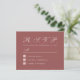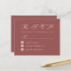 A simple budget RSVP for a marsala wedding colour. It has only blush pink text on marsala background. The title RSVP and the letter M are written in an elegant calligraphic script, the rest in caps. The little squares to check are also blush pink (a very light nuance of pink, close to white). Marsala is a brownish red, a modern colour.