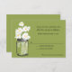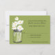 3.5x5 rsvp card: Perfect for a country style wedding or maybe you just love Mason Jars! Old vintage Mason Jar filled with white daisies against a Blooming Spring Green background. If you have any questions on this design or want a colour change please email me paula@labellarue.com Also check for the INVITATION, RECEPTION and GUEST SEATING Cards to match!