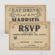 Eat, Drink, and be Married -- Vintage style rustic country western wedding invitation RSVP Response Cards -- Swirly, curly scrolls and old-fashion cowboy style typography in black on old west style grungy playbill poster background. Add the bride and groom names and wedding details in this easy to use template. Elegant but fun and whimsical, retro hand-written style can be can be easily modified for your formal or semi-formal wedding themes. Casual modern country style is perfect for trendy rustic weddings with a fun touch of sophisticated charm for traditional couples. Please contact us for help with customisation if you need additional room for your wedding details. Other sizes and styles available, along with more accessories and wedding kit essentials for diy brides on a budget. Note: This is a paper card with a PRINTED image for decorative effect. There are no real or raised textures.