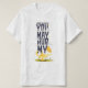 This playful and humourous T-shirt design takes inspiration from the story of Aladdin and the magic lamp, featuring a witty and suggestive twist. The phrase "I'M NOT ALLADIN BUT" appears at the top, followed by "YOU MAY RUB MY" in bold, stacked navy blue letters, separated by whimsical white clouds. A golden magic lamp sits at the bottom, with a puff of yellow smoke emerging, adding to the fun magical theme. Set against a solid black background, the vibrant colours and cheeky wordplay make this an eye-catching and entertaining shirt for those who love humour, puns, and a bit of mischief!