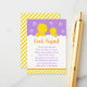 This cute and fun book request enclosure card features an adorable yellow duck and duckling in white soapy bath bubbles on a bright purple background with an orange ribbon and yellow stripes. The text combines handwritten script and sans serif fonts for a stylish and modern look. This is perfect for a Baby Shower.