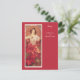 A fine art postcard featuring an illustration by Alphonse Mucha (1860-1939) titled Ruby, from the Precious Stones series. This is a digitally altered and enhanced image from a vintage portrait of a woman seated with poinsettia flowers in the foreground. Ruby is an artwork created in 1900 during the Art Nouveau period, known for its emphasis on modernity and decorative arts.
