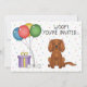 Cute birthday theme design featuring Destei's original cartoon illustration of a cute ruby colour Cavalier King Charles Spaniel breed dog. Next to the dog there are colourful birthday balloons tied on a dog bone and a purple and yellow colour present box. The background has a playful pattern of colourful pastel confetti on a white background. Personalise the sample text areas with the details of your event.