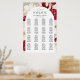 A romantic seating sign featuring ruby-red roses and soft white florals,