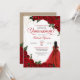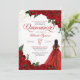 Quinceanera invitation in roby red rose with gold accents and a girl with elegant ball gown. Check the shop for this invitation with girls in different hair colours and skin tones.