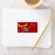 Rudolf the red nosed reindeer character on a red snowy background. Cute Christmas gift tag sticker design.