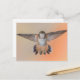 Postcard featuring an orange rufous hummingbird in flight, with its wings and tail feathers wide open, looking directly at you -- a fun card for hummingbird, nature and garden lovers. Photo taken in Pasadena, California.
