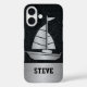 A personalised phone case for the sailor in your life. This design features a silver sailboat on a black diamond plate background. The bottom of the case is lined with a stainless steel colour and can be personalised with any name.