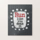 A cute typographic design that says "Run Like You Mean It". It features black and red text on a white rectangle with funky, playful white dots surrounding it, all on a grey background.