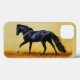 Painting of a beautiful black stallion with a long flowing tail galloping across a grassy field. Realistic artwork created from an original oil painting by equine and wildlife artist Crista S. Forest.