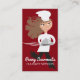 Cute modern brunette woman wearing a chef's hat and jacket, running with a dome platter or food dish on this business card for personal or private chef, caterer or catering, meal delivery, cooking classes or other food or culinary business.