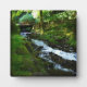 Beautiful green moss & ferns along the runoff waters of Wahkeena Falls in the Columbia River Gorge, Oregon. View of the water flowing under the bridge of the historic Columbia highway.