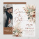 Set the tone for your big day with this Rust Boho Terracotta Save The Date Card. This design features a stunning arrangement of dried florals, eucalyptus, and feathery pampas grass in a warm, earthy colour palette of terracotta, cream, and dusty sage.