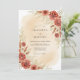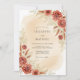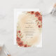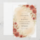 This design features a warm rust and cream color palette perfect for an organic aesthetic. Rich dahlias and roses are paired with feathery pampas grass and dried botanical elements for a bohemian style. A soft watercolor wash adds depth to the rustic feel, capturing the essence of a cozy autumnal event.