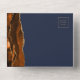 The left-hand edge of this elegant modern all-in-one wedding invitation and RSVP features a burnt orange and rust watercolor agate border trimmed with faux gold glitter. The customisable text combines gold-coloured modern handwriting and sans serif fonts on a navy blue background. The return address appears on the outside flap and on the reverse side of the RSVP.