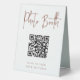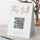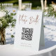 Make it easy for your wedding or event guests to download their photo booth pics with this QR code table tent sign. "Photo Booth" appears at the top, with brief instructions beneath. Enter the url for your pictures, and the QR code will update. Guests can scan the code with their phones to see or download their snaps.