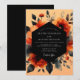 An artistic display of moody botanicals sets a dramatic tone for your nuptials. This painterly design features vibrant rust-orange roses and deep crimson blossoms, artfully arranged against a warm apricot backdrop. Dark, charcoal-hued foliage provides a striking contrast, creating an elegant and romantic atmosphere.