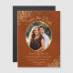 These beautiful wedding save the date cards feature an elegant rust orange or burnt sienna and gold design with your photo in an oval shaped frame with ornate golden curls and swirls in the corners. The title is written in elegant script lettering and there is space for your names, the date, and wedding location. Great way to make it easy for your friends and family to remember your upcoming wedding date. The magnetic back makes these cards easy to display on a refrigerator or other metal surface.