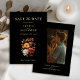Announce your special day with this Rustic Autumn Bloom Save the Date Card, featuring a lush watercolor bouquet in rich rust and natural fall tones set against a bold black background. Perfect for autumn weddings with a rustic, botanical, or earthy theme. The back of the card includes space for a personal photo, making it both stylish and heartfelt. Fully customisable to fit your unique celebration.