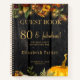 Beautiful rusty orange and dark burgundy autumn fall flowers and pumpkin borders with strings of golden twinkle lights over a dark brown barn wood background making a charming elegant 21st, 30th, 40th, 50th, 60th, 70th, 75th, 80th, 90th 100th (any age) years birthday party guest book with a trendy handwriting gold typography script. +++++++++ Easy to personalise with your details! Suitable for traditional rustic country farmhouse outdoor backyard family and friends gatherings.