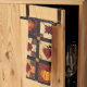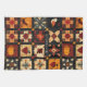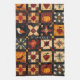 This kitchen towel features a rustic patchwork quilt pattern arranged in a cosy grid of fabric blocks. Each block highlights unique autumnal motifs such as pumpkins, birds, apples, and hearts, alongside intricate geometric patterns including stars, squares, and floral or snowflake-inspired designs. Rendered in warm earthy tones of orange, red, brown, and cream against a deep dark background, the quilt captures the essence of fall and harvest season. With contrasting borders between the blocks, this farmhouse-style folk art design is perfect for Thanksgiving décor, rustic crafts, fabric-inspired DIY projects, and country-style autumn home design.