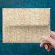 This envelope has a realistic burlap print on the outside and a pumpkin orange interior. Three sweet pumpkins peek out from inside the envelope. One pumpkin has black and white buffalo plaid and another is white with a leopard print.