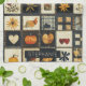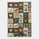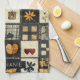 This autumn patchwork quilt-inspired kitchen towel features warm seasonal motifs arranged in rustic squares. Pumpkins, birds, hearts, and floral branches appear alongside plaid and chequerboard blocks, with stars, snowflake-like shapes, and baskets adding charming variety. Rendered in earthy tones of orange, brown, cream, red, and black, it captures the cosy farmhouse aesthetic of the harvest season. Perfect for Thanksgiving, rustic country décor, fall crafts, and anyone who loves primitive folk art style.