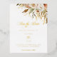 The romance of an Autumn wedding is captured in this elegant design featuring watercolor roses and greenery in warm Fall colours of terracotta, ivory, rust, chestnut, dusty blue and sage green with touches of gold foil sparkles. This design also features unique text graphics in a custom calligraphy script font with colour that can be customised using the design editor tool as well as real gold foil text.