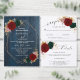 This wedding invitation features a rich, autumnal palette with burgundy, emerald green, and gold accents. A cluster of flowers in these colours sits at the top. The design evokes a rustic yet elegant feel, perfect for a fall wedding.
