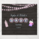 Pink string lights header at top, pink bottle on left and frothy mug of beer on right on a rustic, dark wood. Blue, white and pink bottle cap "Baby" typography. Templates created for you.