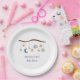 These adorable baby shower paper plates feature a rustic baby mobile with night sky imagery dangling from a wood branch. All text may be customised.