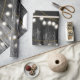 A rustic barn black wood background with hanging gold string lights. A country rustic burnt wood feel with a touch of golden glam.