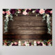 An extra large 54 by 40 inch poster board with a rustic vintage reclaimed barn board wood background. A bough of deep burgundy and blush pink florals cascade amongst silver greenery garlands and romantic candle-lit floral bouquets bursting with peony flowers and sprays of floral artistry. This poster is blank so that you may enter your text and use it for any occasion.